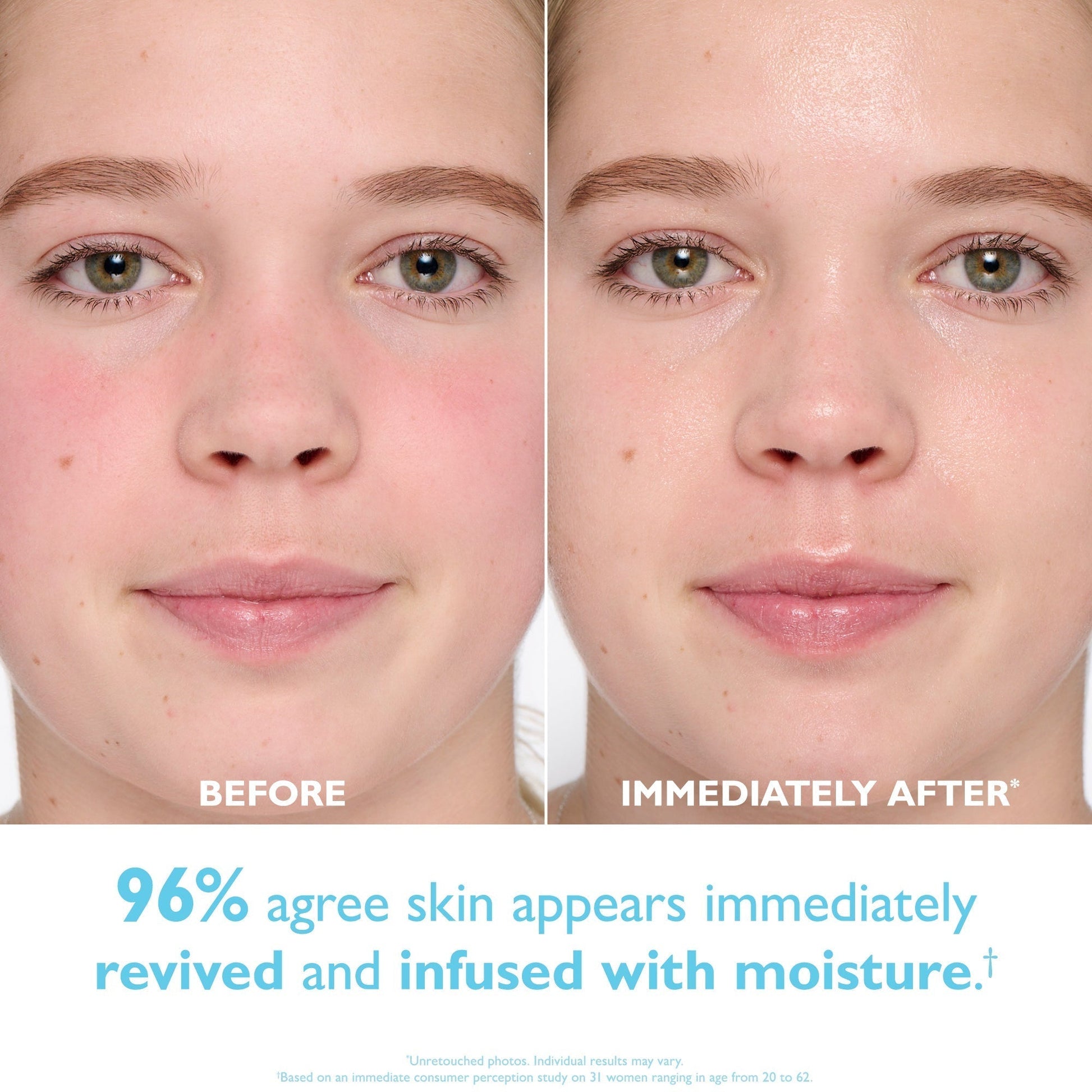 This spray-on ice facial instantly revives the look of dry, puffy skin and is clinically proven to immediately decrease skin temperature.* Infused with Hyaluronic Acid, IceAwake™ Activating Technology, Caffeine and Peppermint, this light and refreshing mist hydrates, cools and de-puffs the look of tired skin affected by external stressors or a poor night’s rest. Green, Red and White Teas help calm the look of redness. Ophthalmologist-tested.